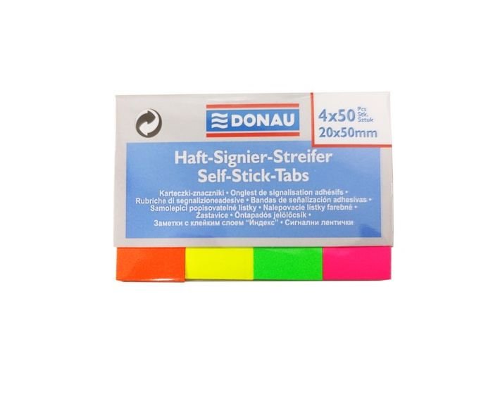 Lot de 4 onglets de classement DONAU – 20 × 50 mm – 4×50 onglets – Couleurs assorties néon (7576001PL-99)
