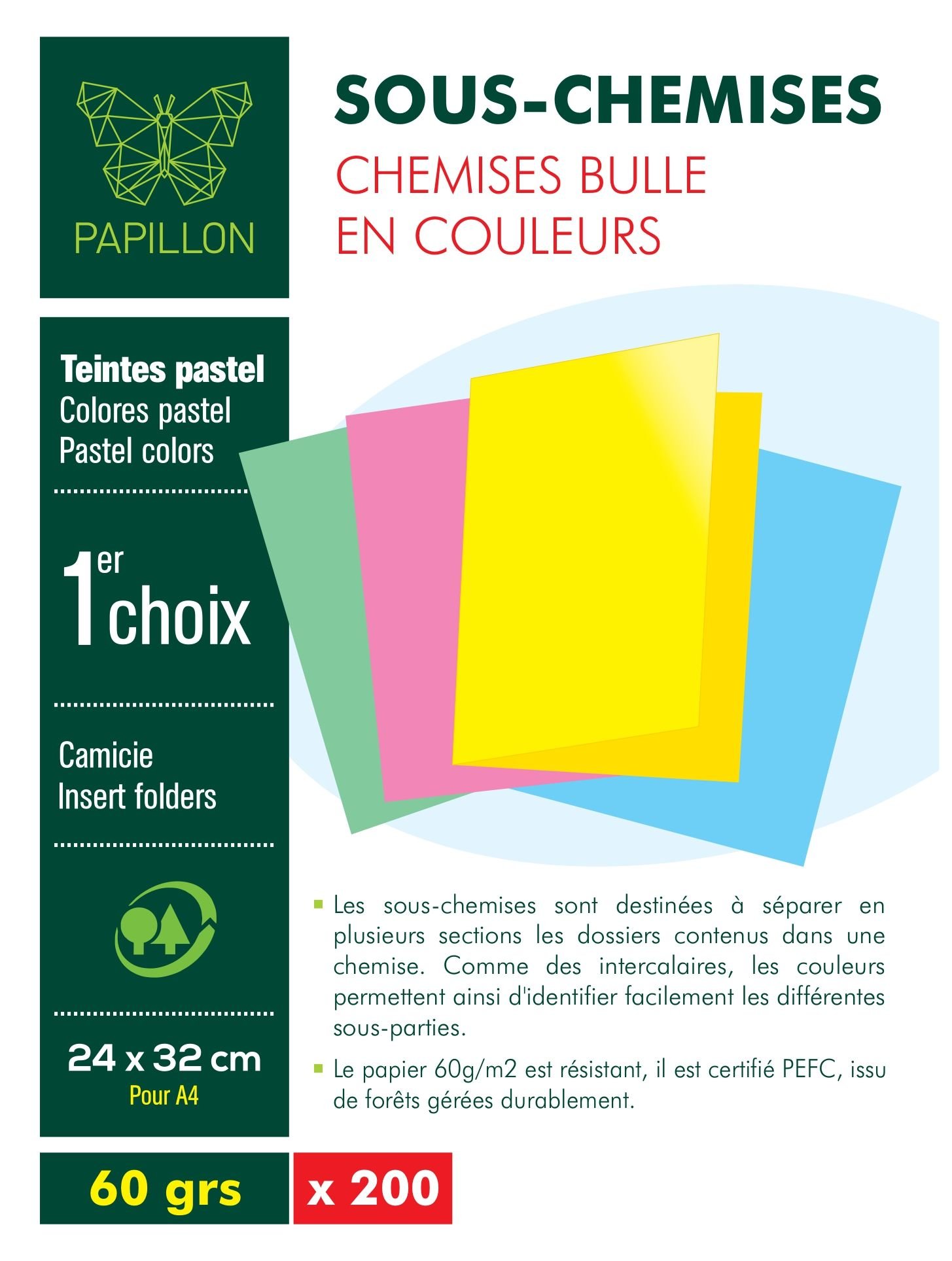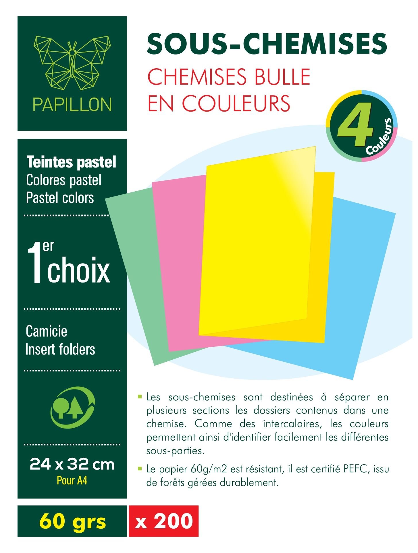 Paquet de 200 sous-chemises bulle PAPILLON A4 – 60 g – 24 x 32 cm couleurs pastel assorties