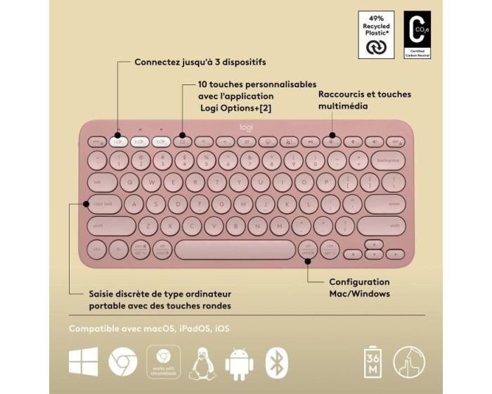 Clavier sans fil LOGITECH Pebble Keys 2 K380s Bluetooth Bouton Easy Switch ROSE (920-011805)