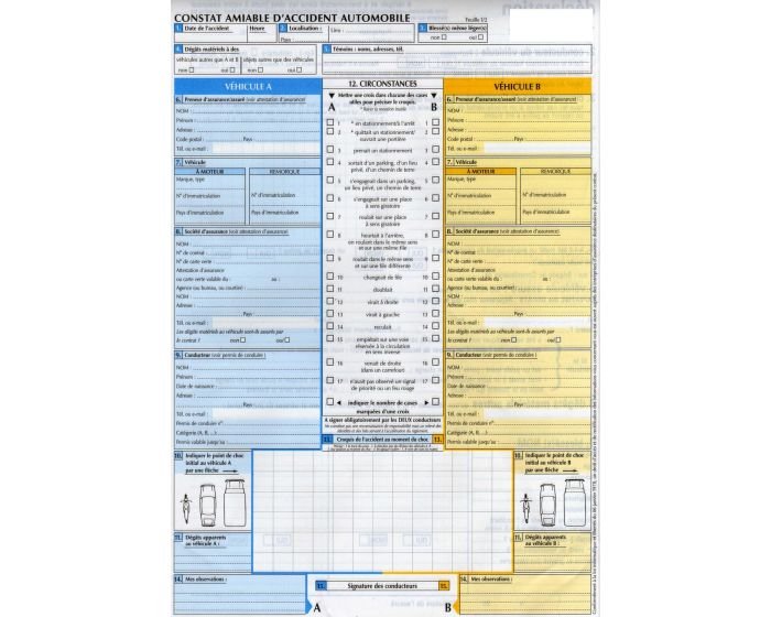 100 fiches de constat automobile à l’amiable. Pour vous faciliter le règlement d’un sinistre automobile et dont nous conseillons l’utilisation systématique (même en cas d’accident sans tiers).