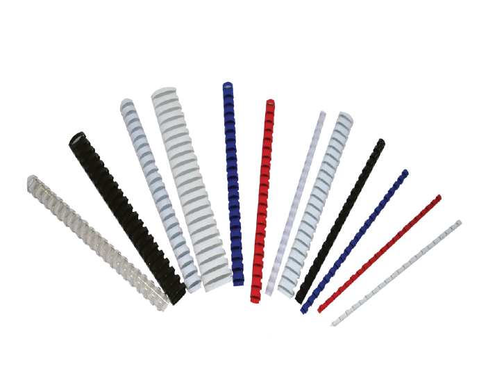 Baguettes spirales plastique 8 mm pour reliure A4. Capacité : 40 feuilles. Couleurs au choix : Blanc-Bleu-Noir