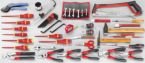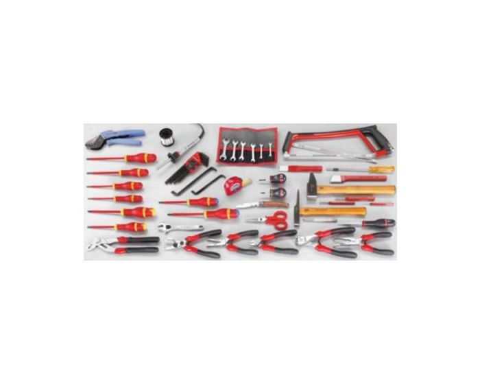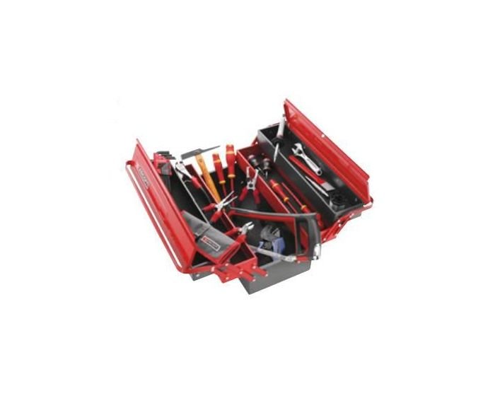 Caisse à outils comprenant 52 outils à mains professionnels pour usage électronique avec 5 compartiments. Dimensions 470 x 220 x 215mm. Poids 11.7kg.