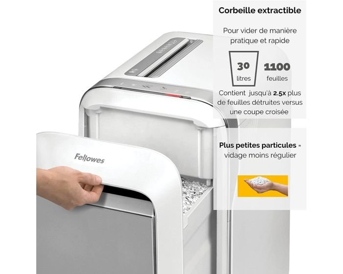 – Capacité de passage de 20 feuilles et corbeille extractible de 30 litres