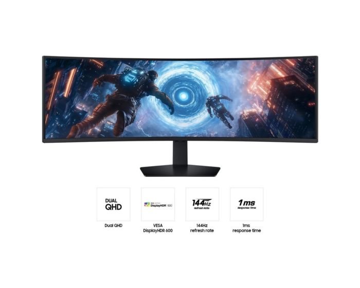 Curved Dual QHD, VESA DisplayHDR 600, 144Hz refresh rate & 1ms response time. Wrap yourself in greater detail. 5120 x 1440 QHD. Explore hidden details in the shadows. VESA certified DisplayHDR 600 logo. Minimized lag for more wins.